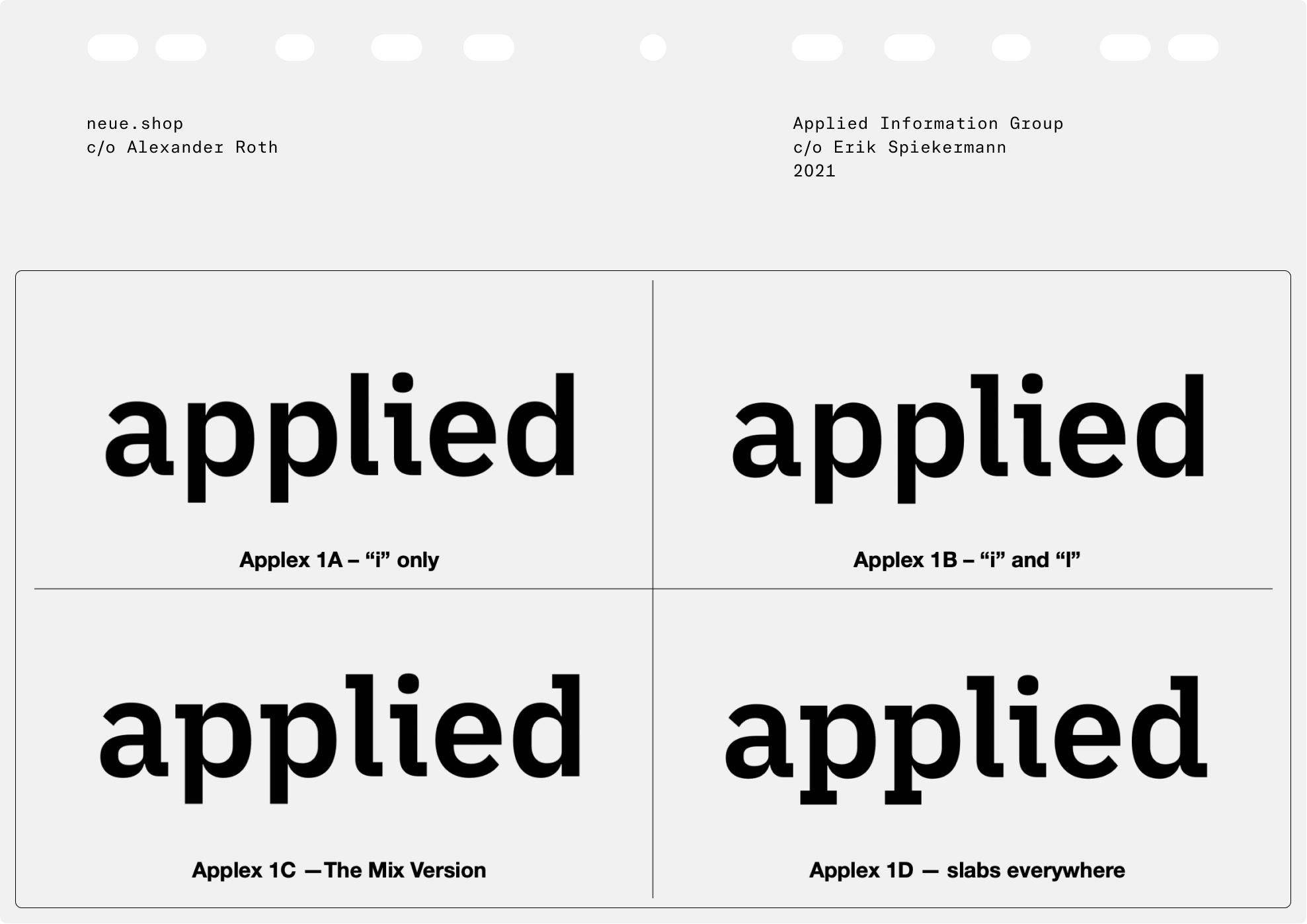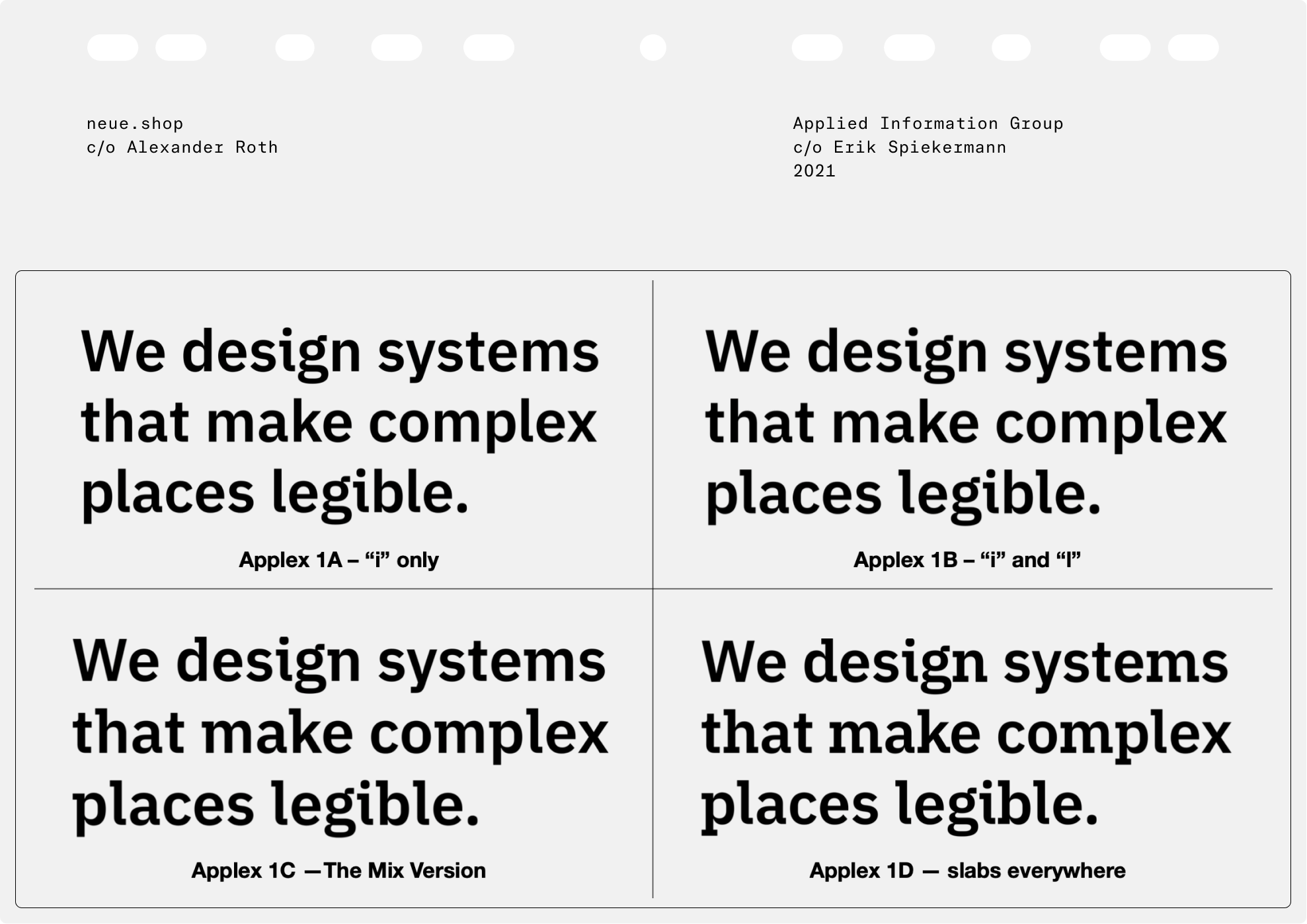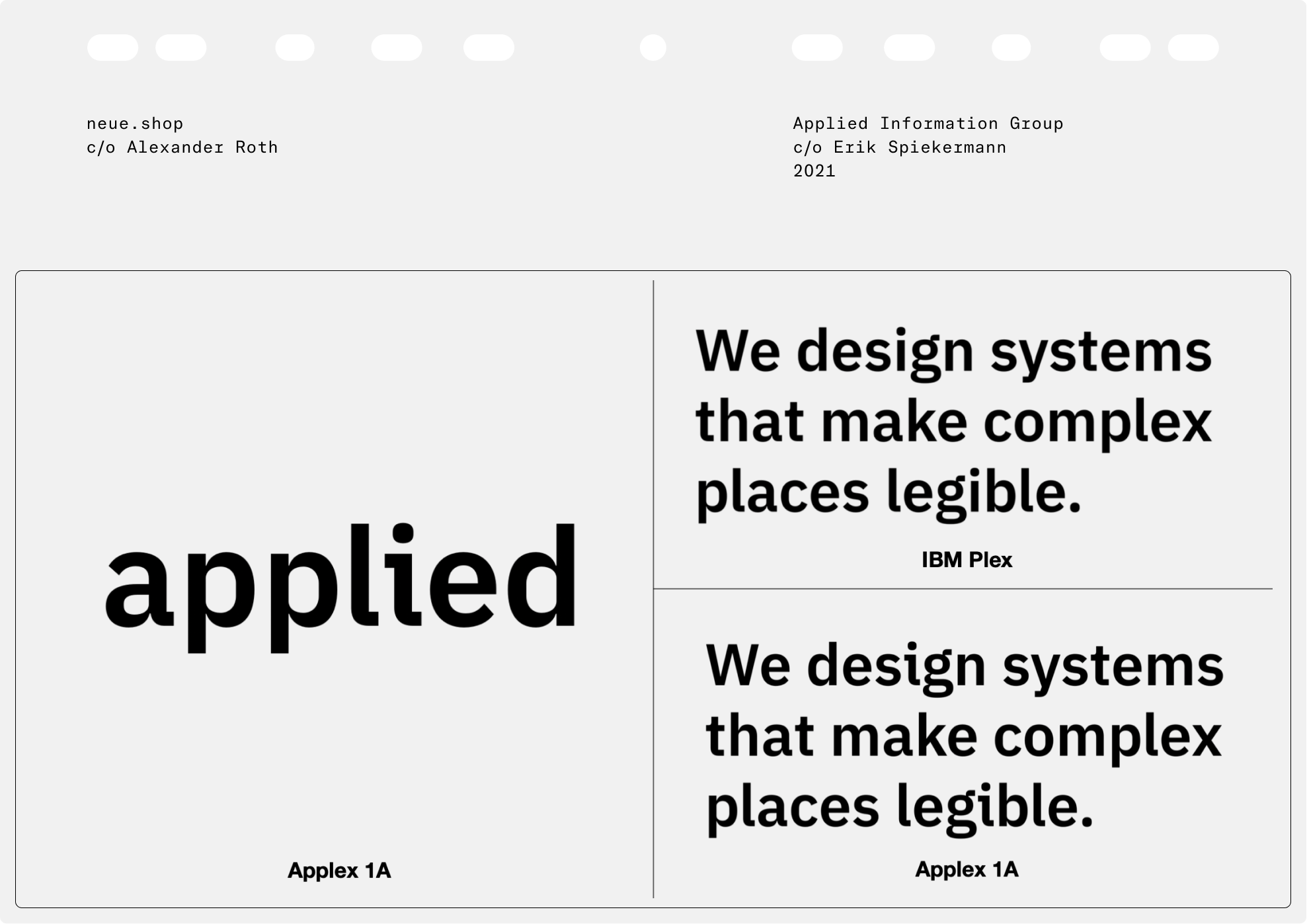 Under the creative direction of Erik Spiekermann a custom version of IBM Plex was developed for the Applied Information Group — internationally renowned spatial experience designers with clients such as Google, Princeton, London and Paris.
