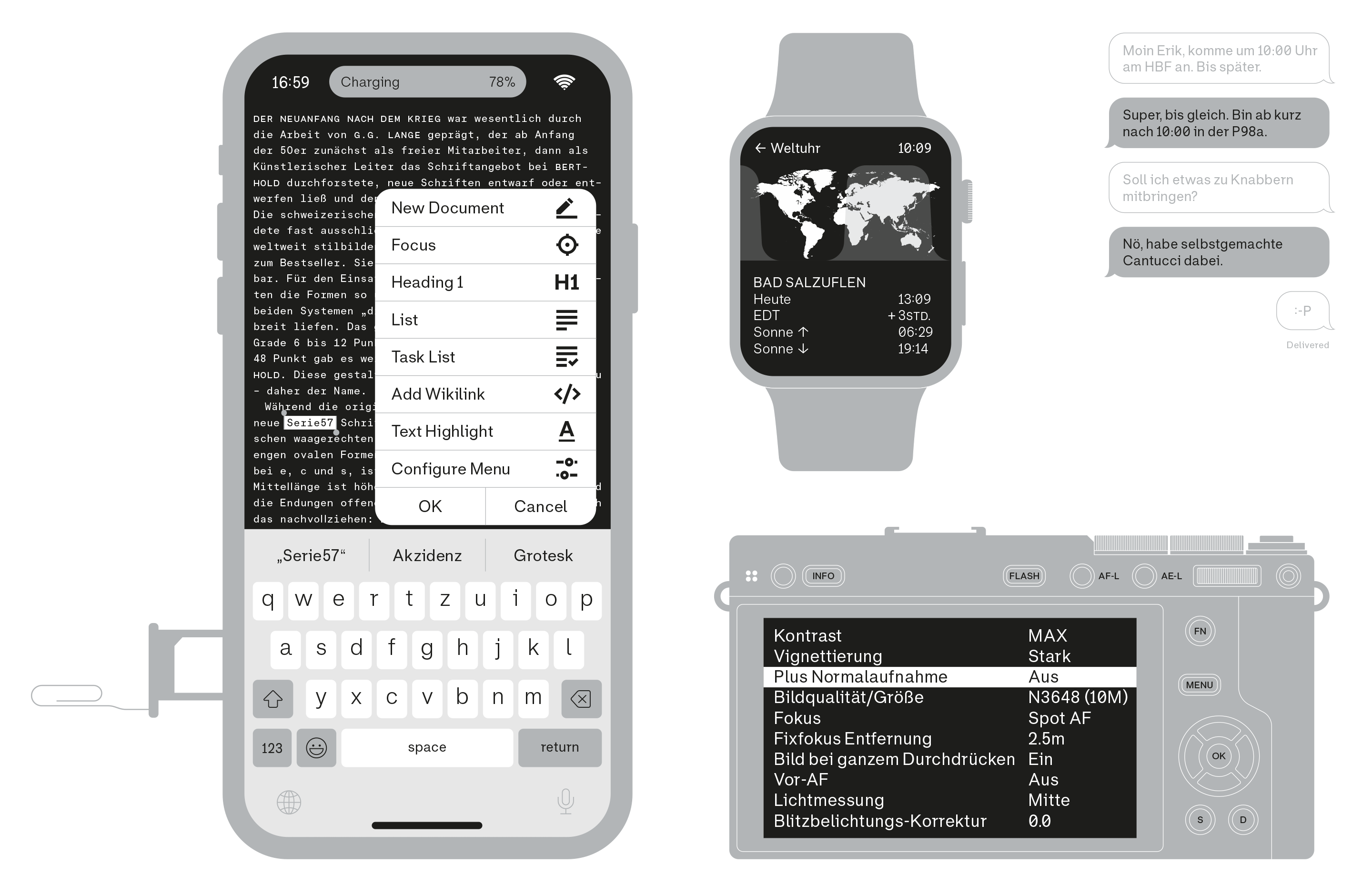 The weights of AG Serie 57 from 14 point up would have had what it takes to become the basis of a new, more neutral typeface. However, Berthold never featured them in any of their specimens. It was only when we discovered them in a mislabeled case and looked them up in an old specimen, we remembered that the form differed considerably from the other weights. All this time, we hadn’t looked closely enough and hadn’t noticed that AG Serie 57 could be the basis for an independent family, starting with the 14-point cut.