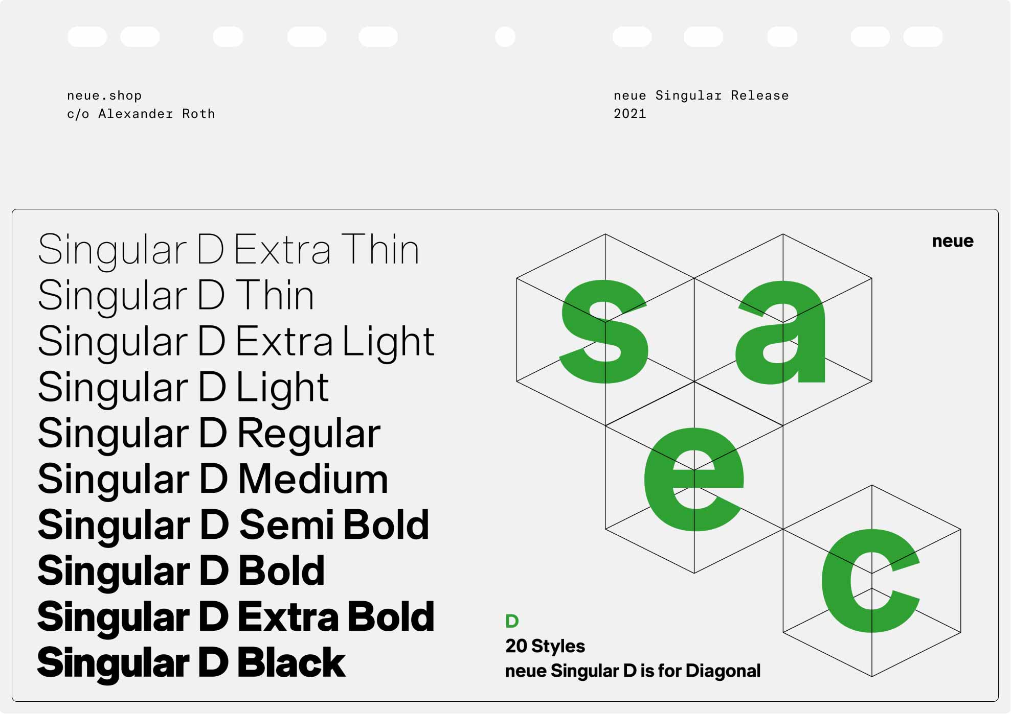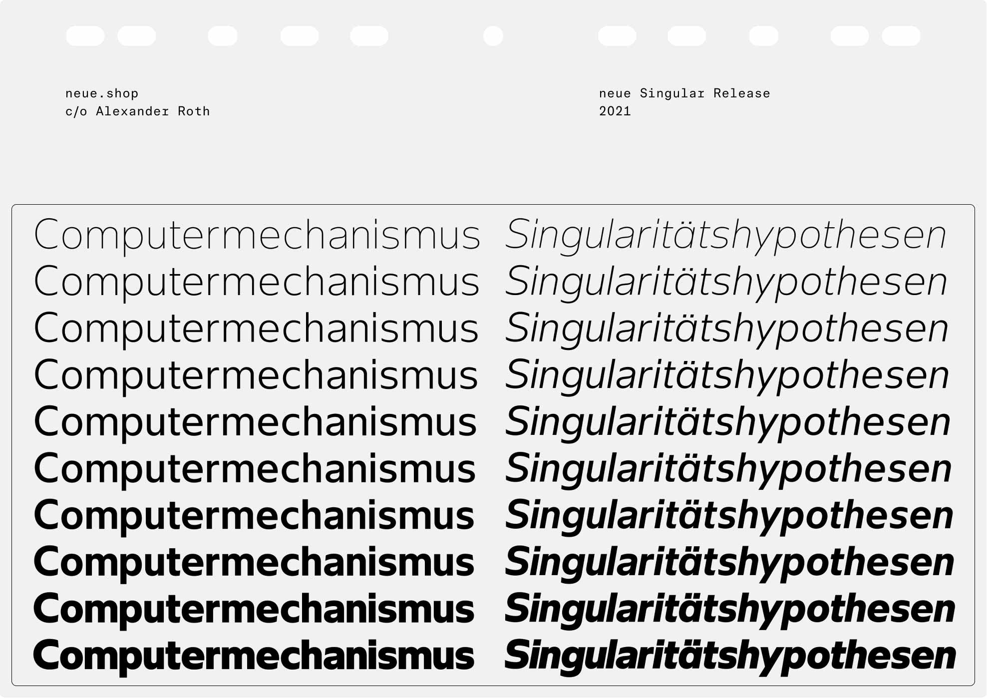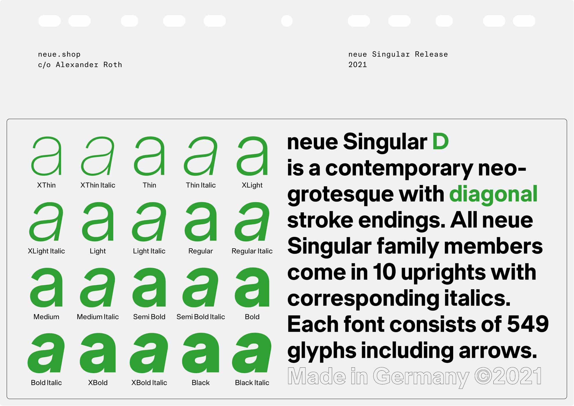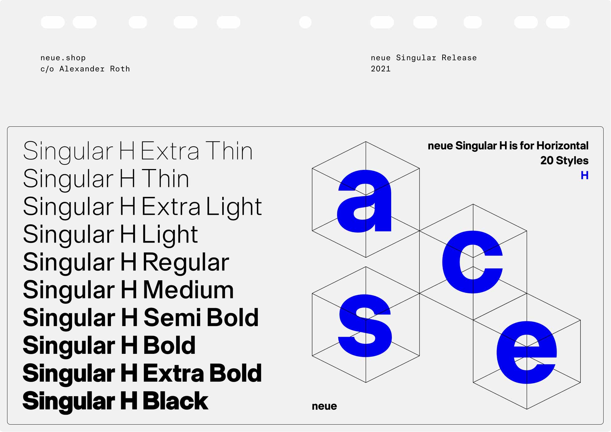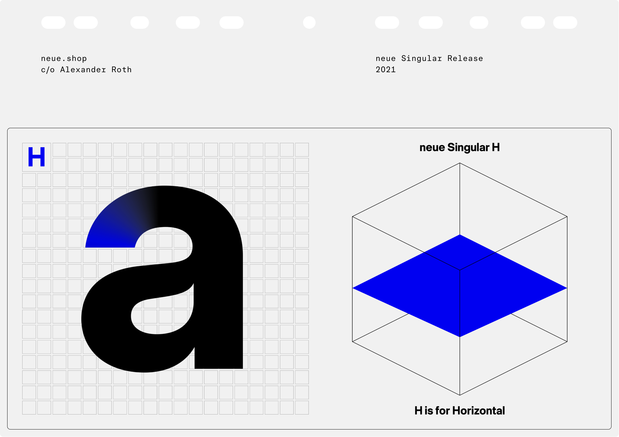 neue Singular is a contemporary Neo-grotesque sans-serif designed in three variants. The suffixes H, D, and V indicate the corresponding treatment of the stroke endings: H for horizontal, D for diagonal, and V for vertical.