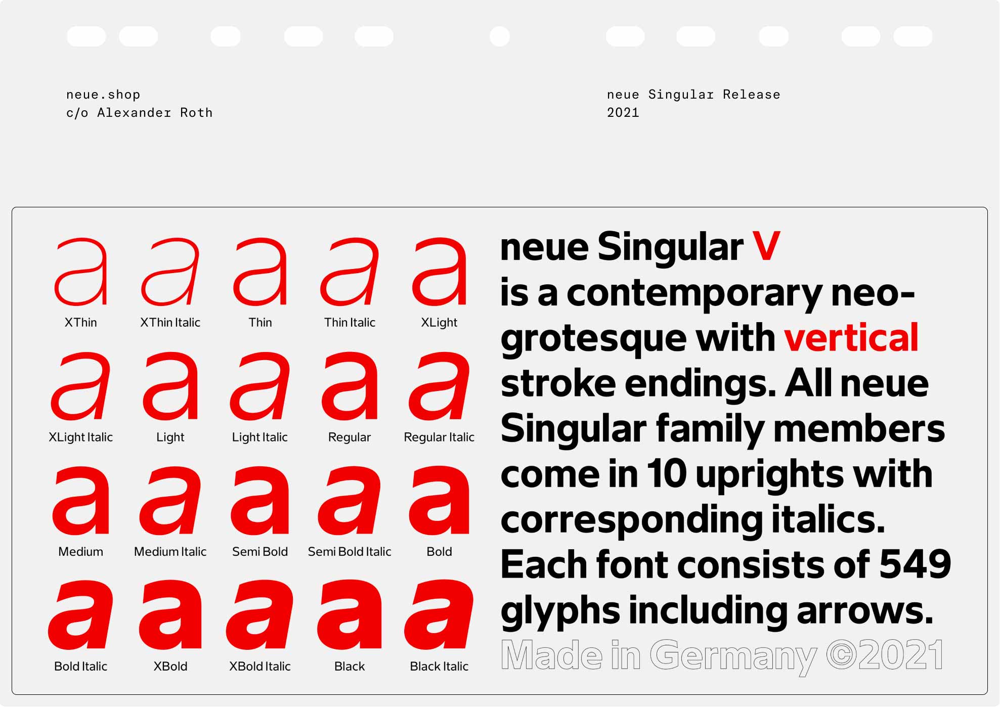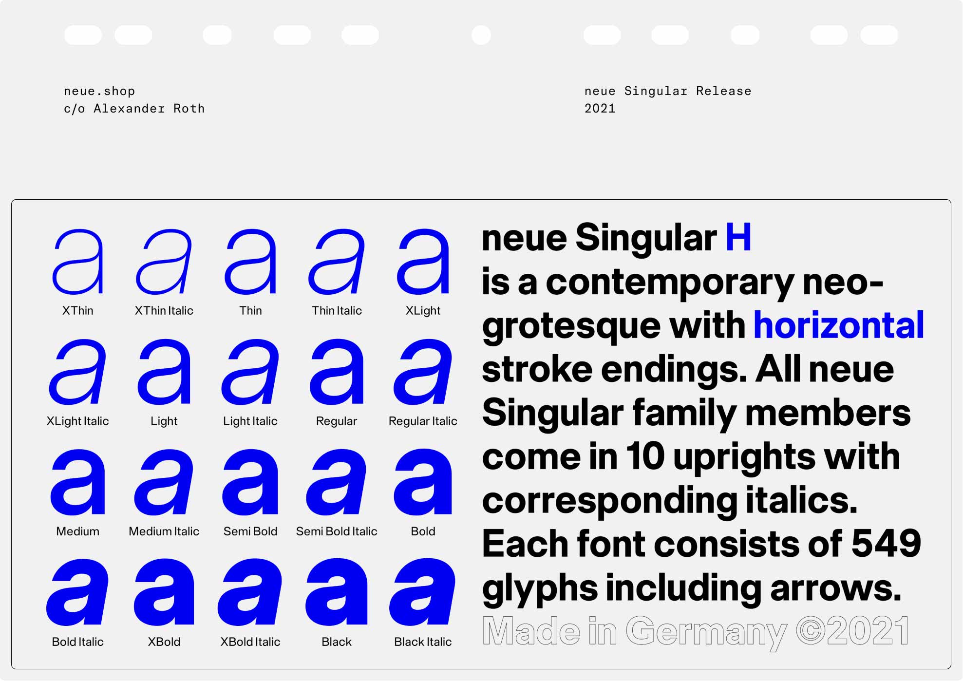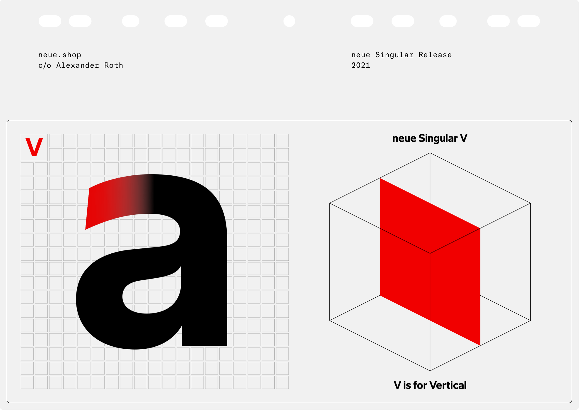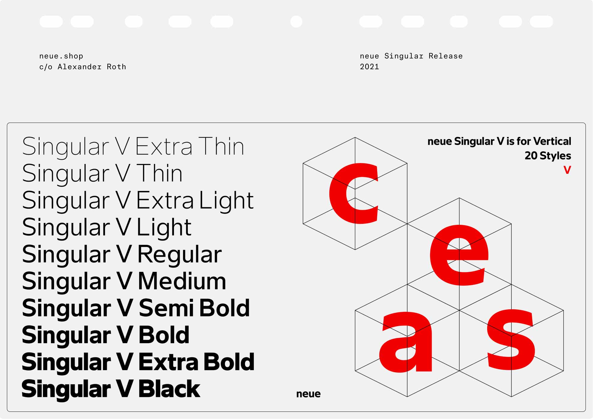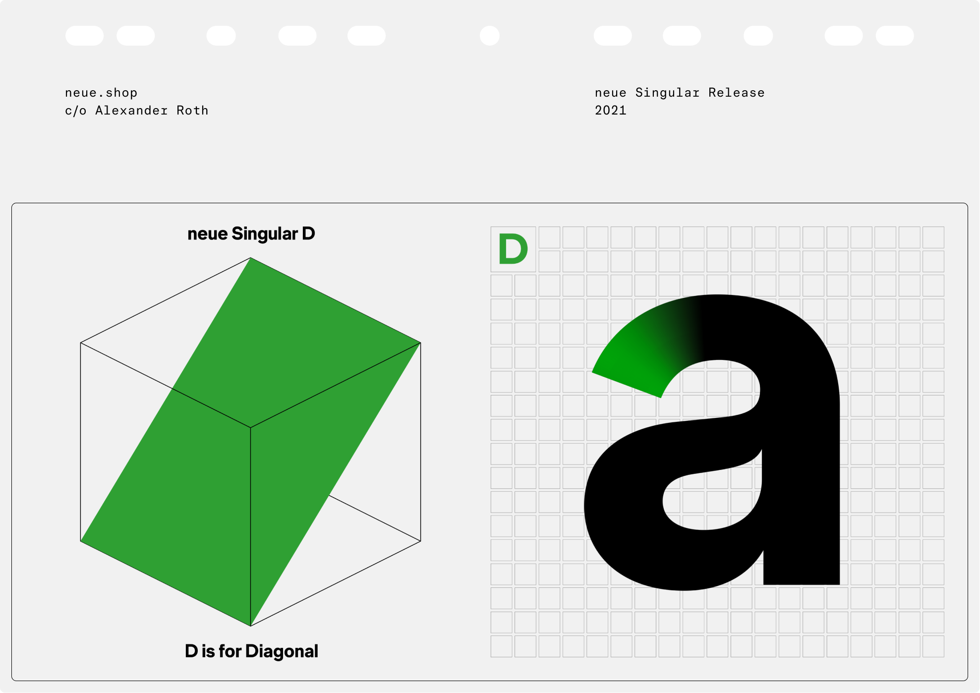 neue Singular is a contemporary Neo-grotesque sans-serif designed in three variants. The suffixes H, D, and V indicate the corresponding treatment of the stroke endings: H for horizontal, D for diagonal, and V for vertical.