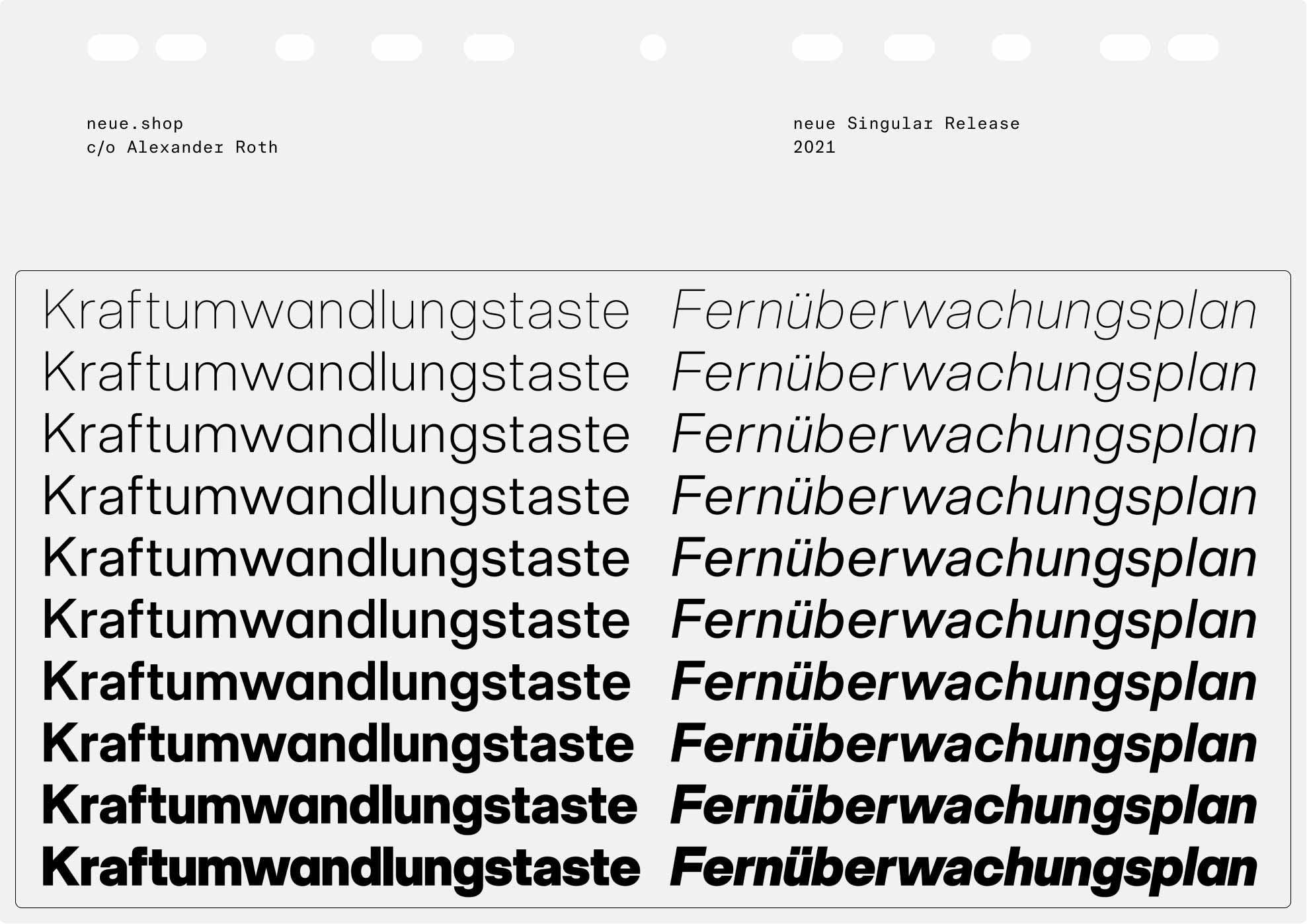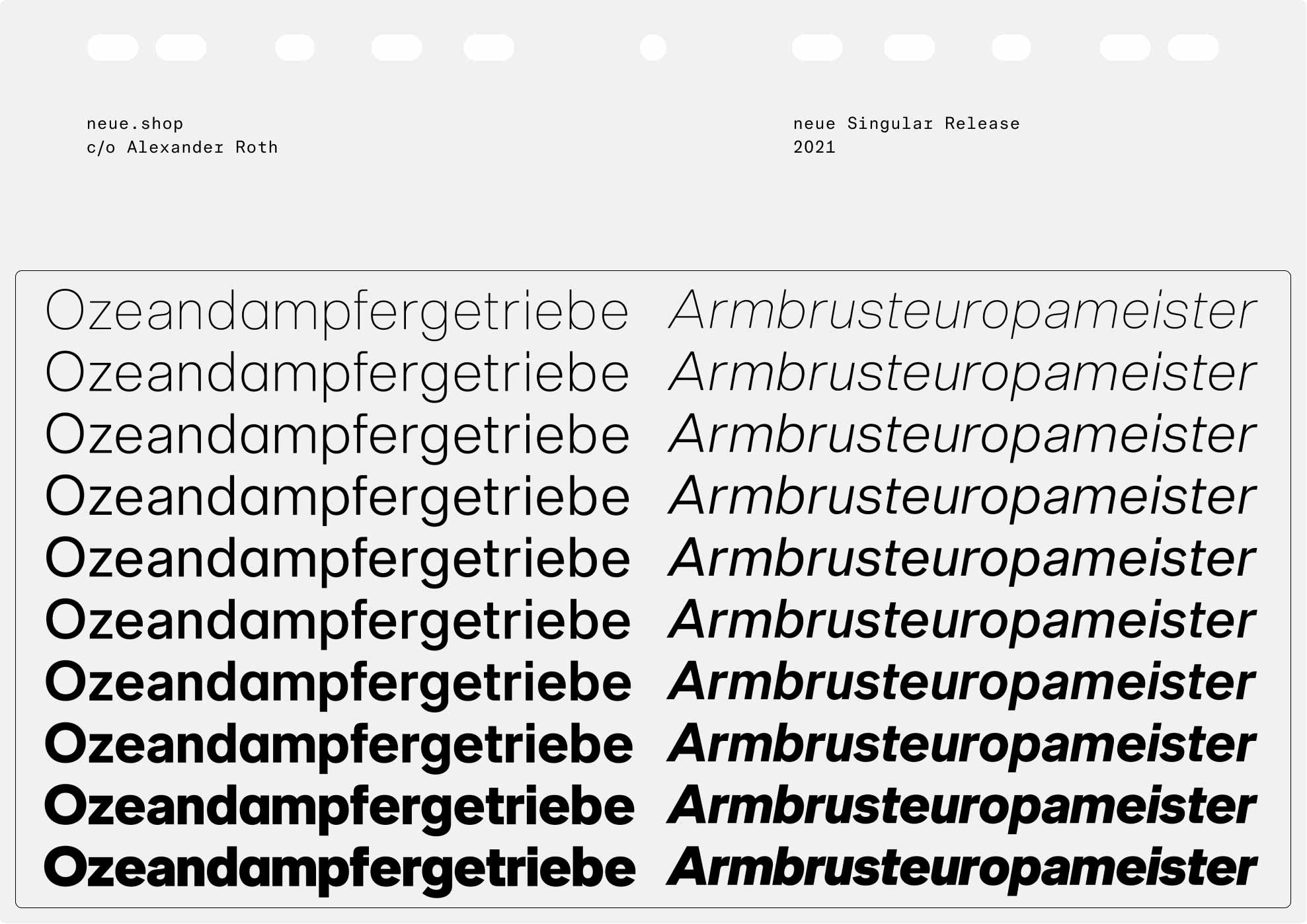 Try before you buy. neue offers Trial Fonts for each family with a reduced character set Download trial fonts. Want to customize one of our retail fonts? Sometimes a small modification of an already existing neue font does the job Learn more about Custom Fonts. Let’s have a Video Call in case you prefer it over writing emails Schedule a video call. Get in touch: neue, c/o Alexander Roth, Gartenstraße 10, 32756 Detmold, Germany Find us on the mapEmailInstagramLinkedIn.