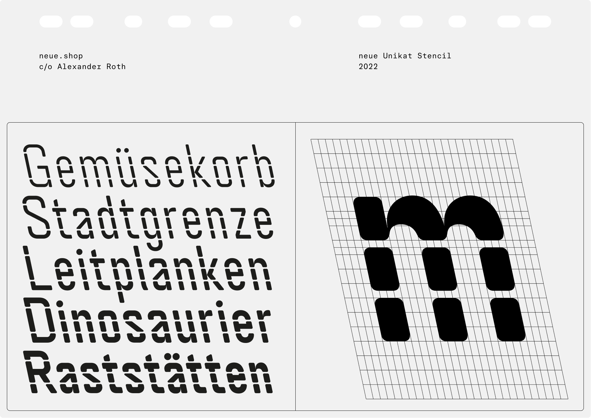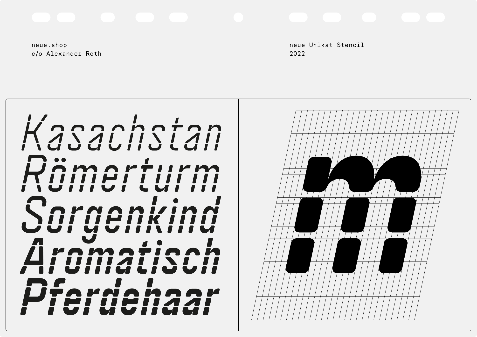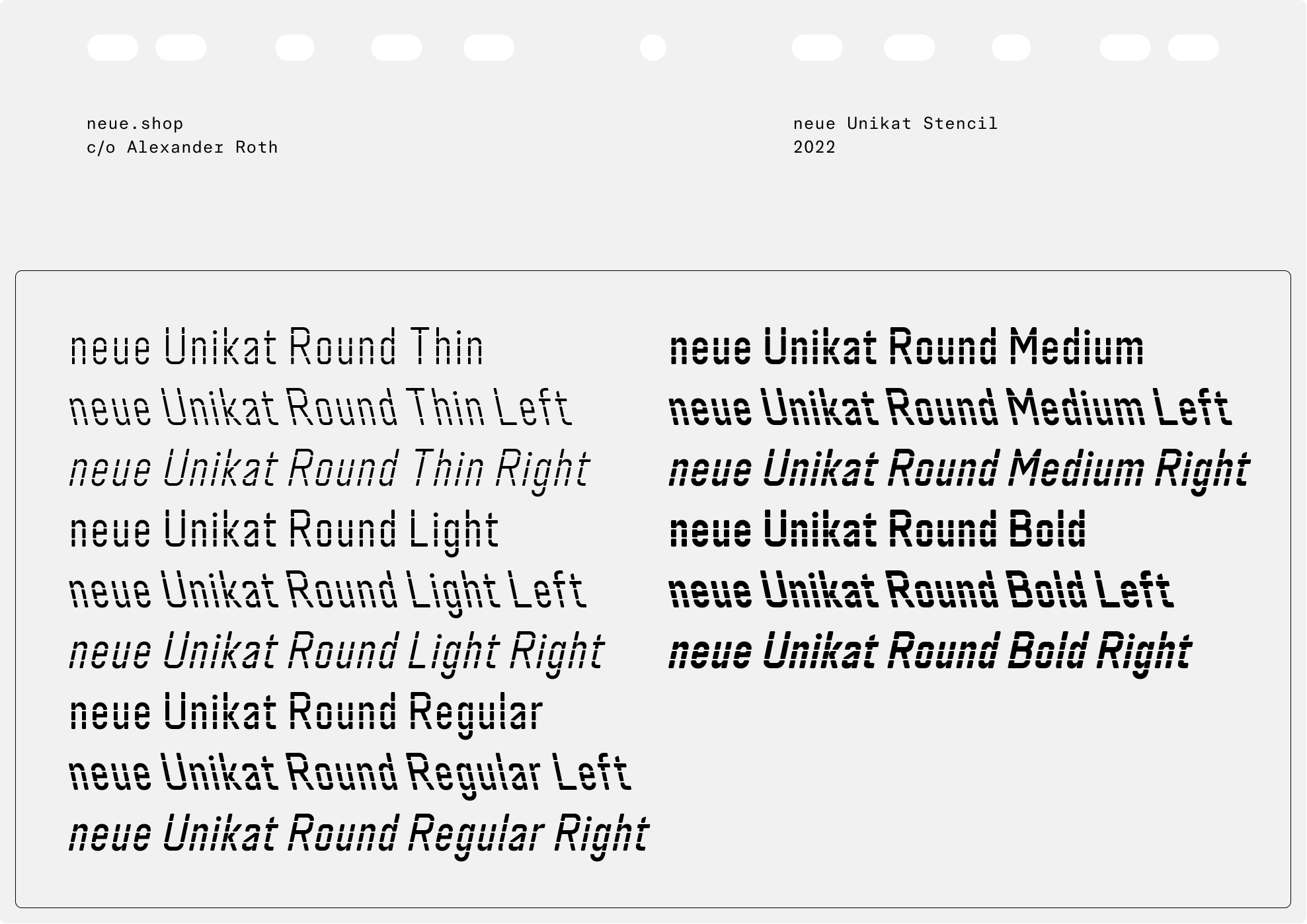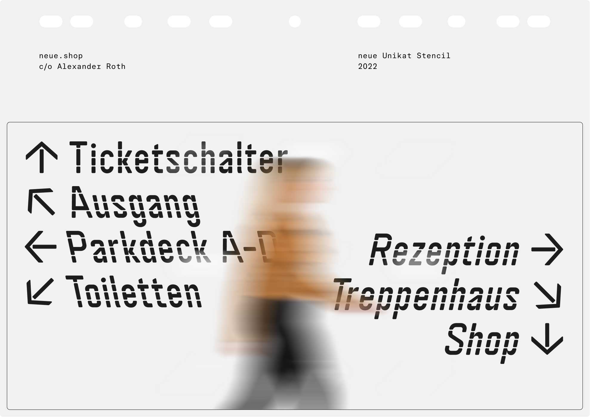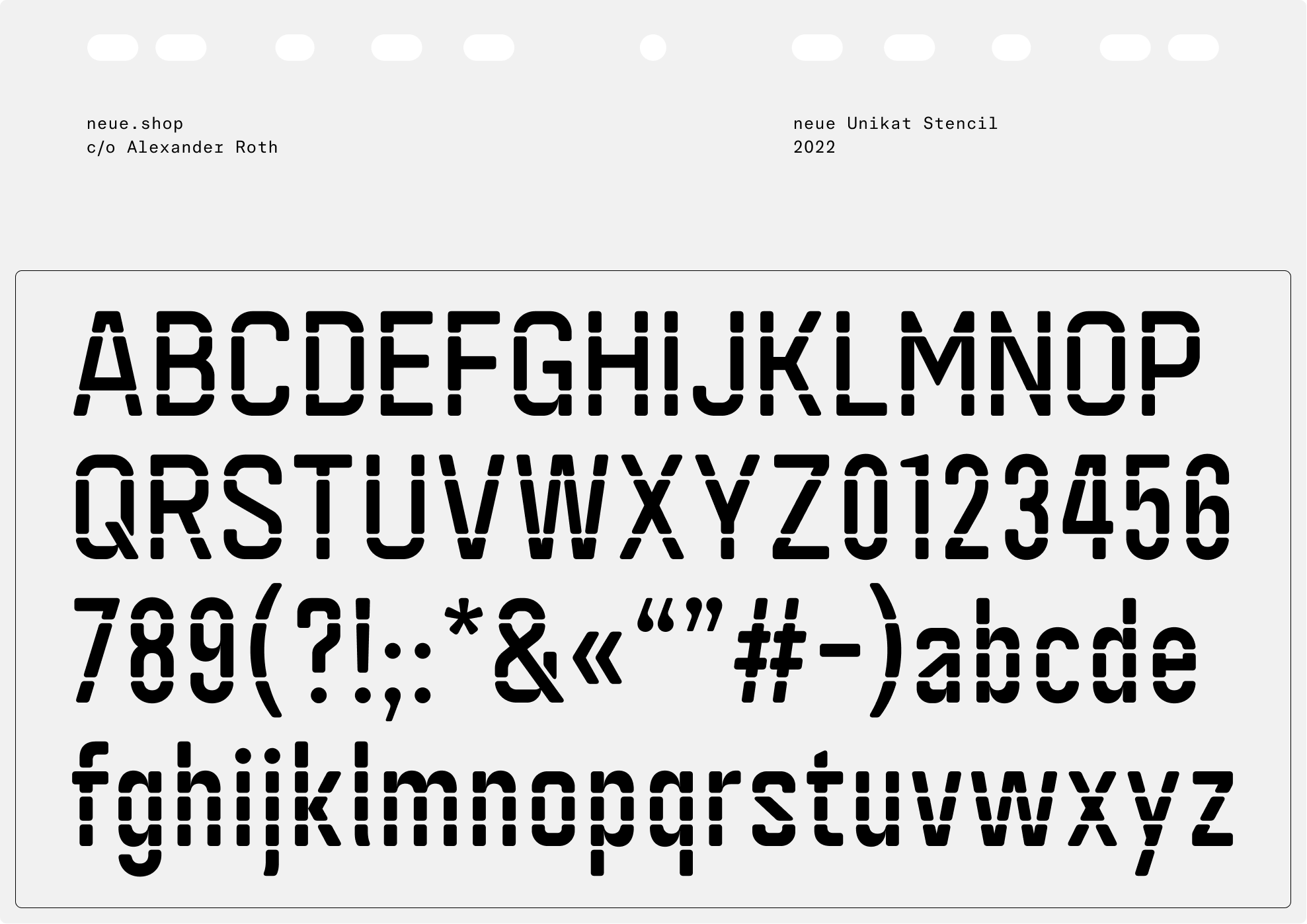 neue Unikat Stencil is a further extension of our neue Unikat Superfamily — in addition to normal and round. Inspired by (typo)graphic street markings and with its multiple horizontal-only cuts this font family is far away from a traditional stencil designs.