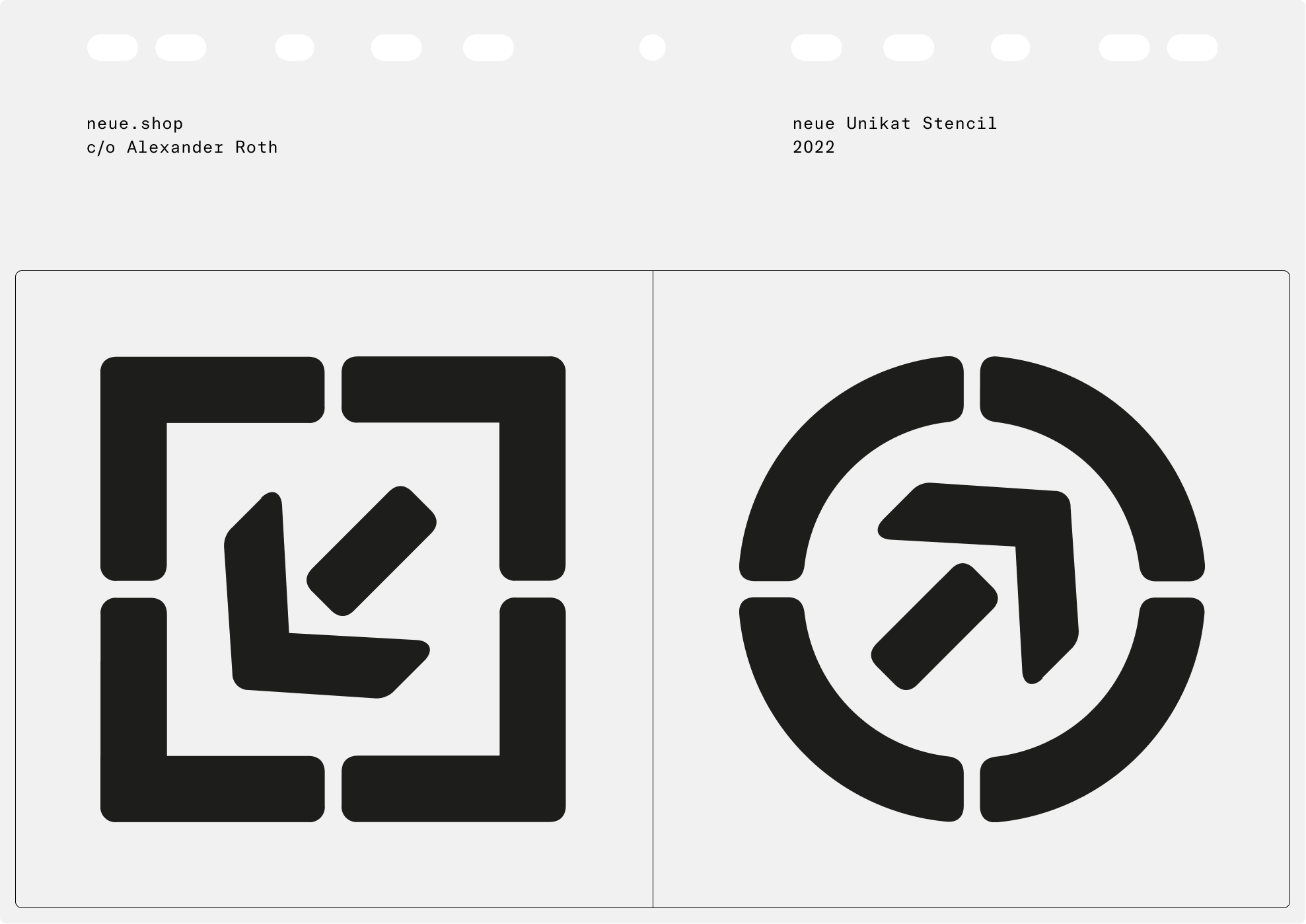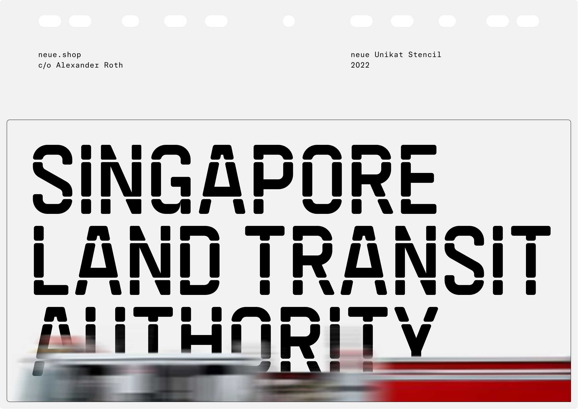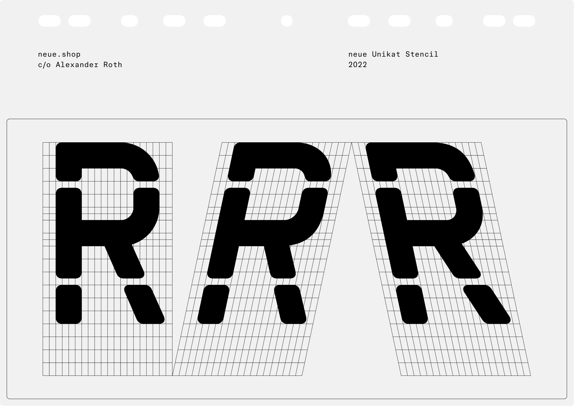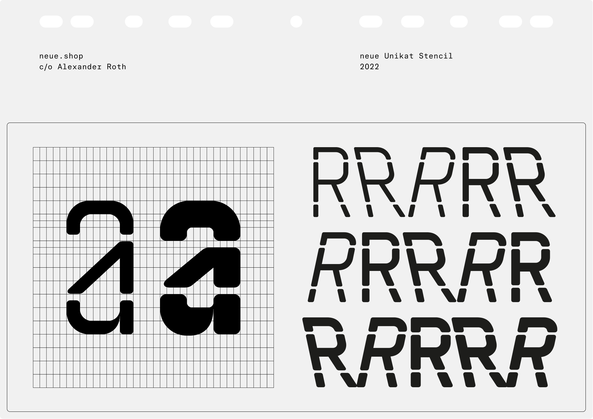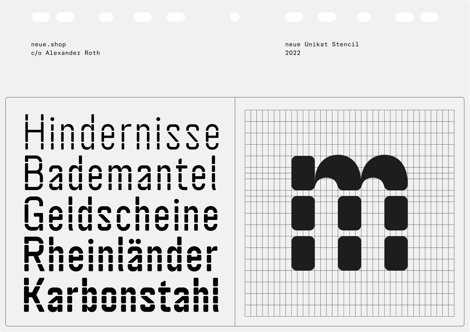 neue Unikat Stencil is a further extension of our neue Unikat Superfamily — in addition to normal and round. Inspired by (typo)graphic street markings and with its multiple horizontal-only cuts this font family is far away from a traditional stencil designs.