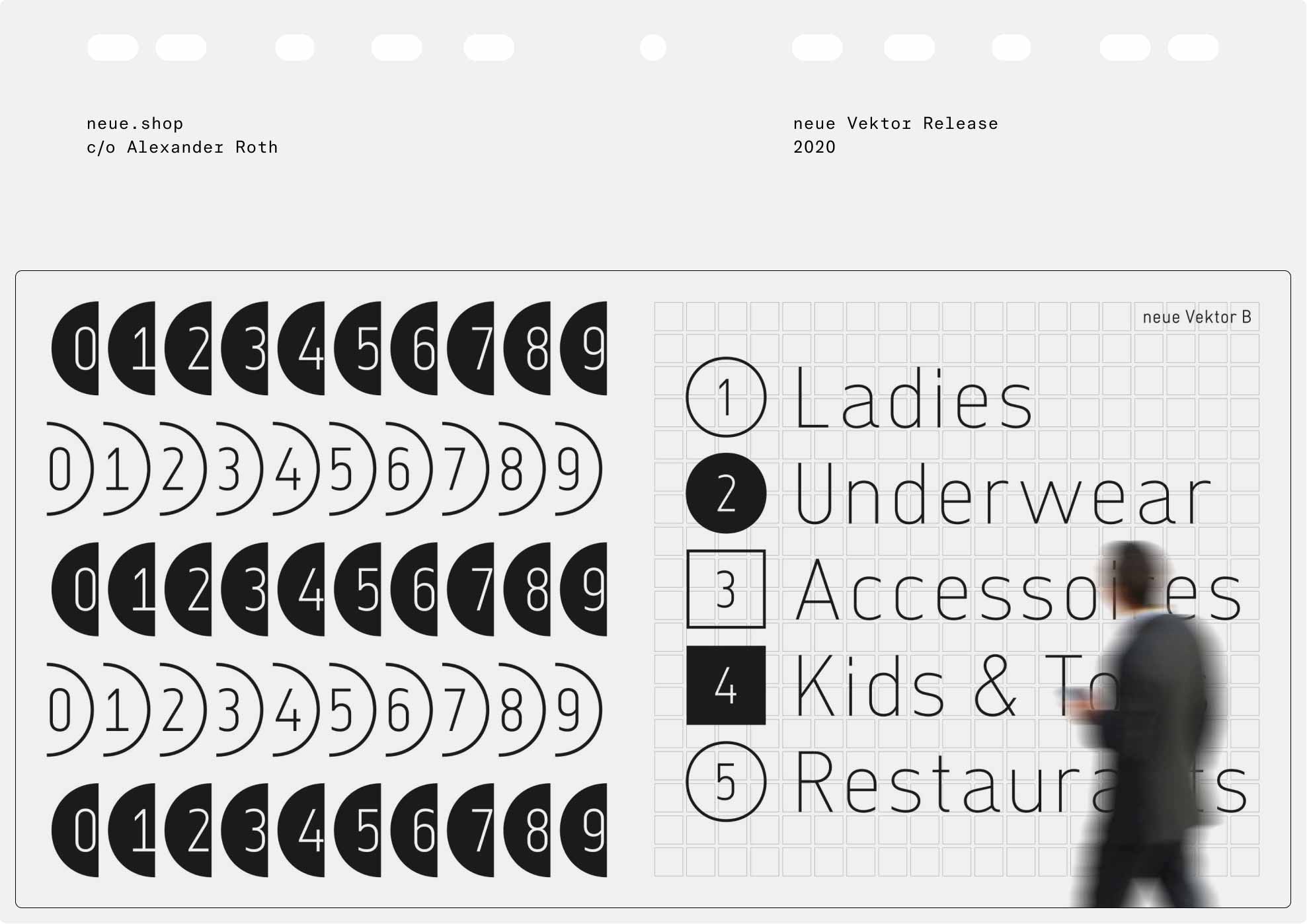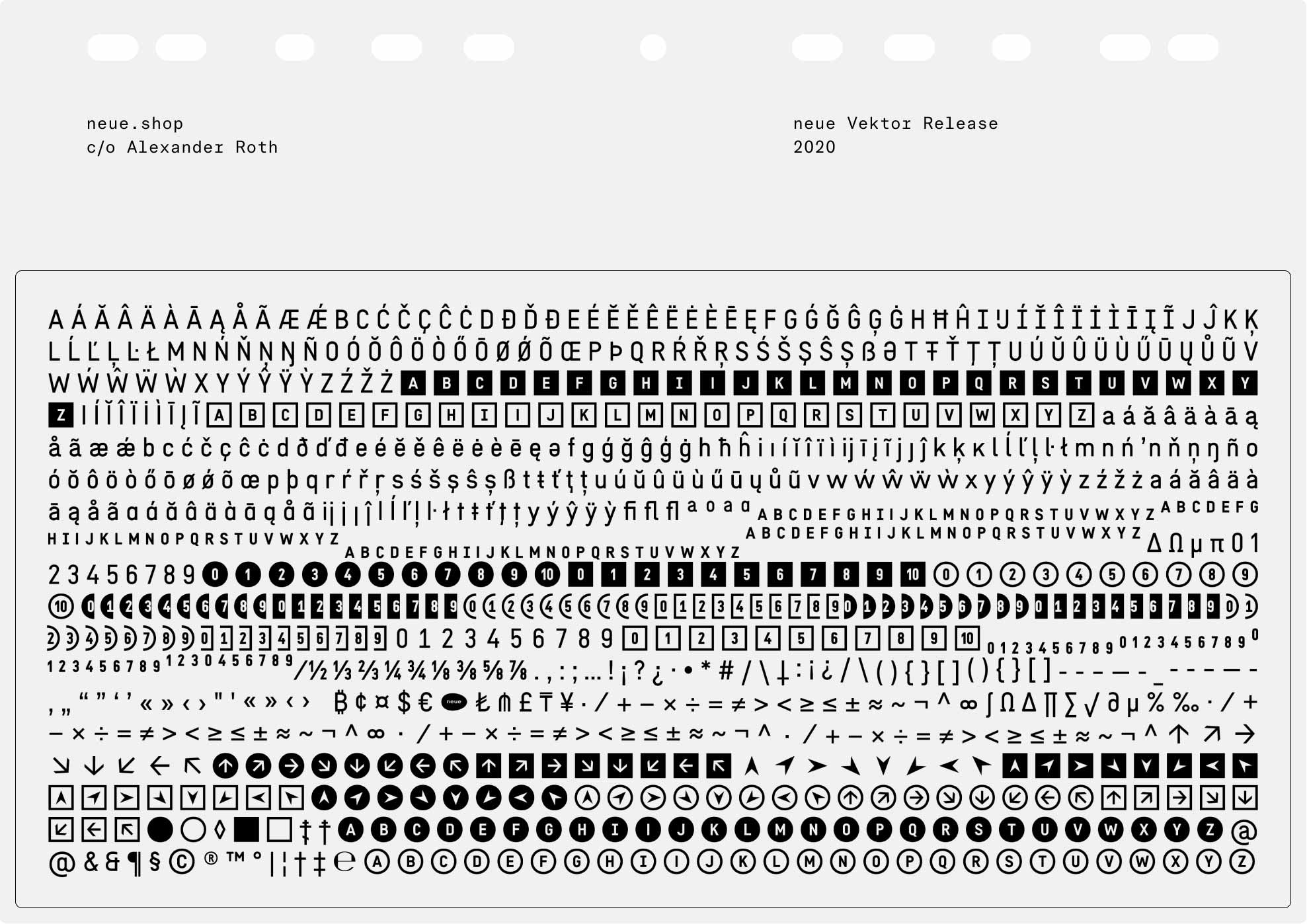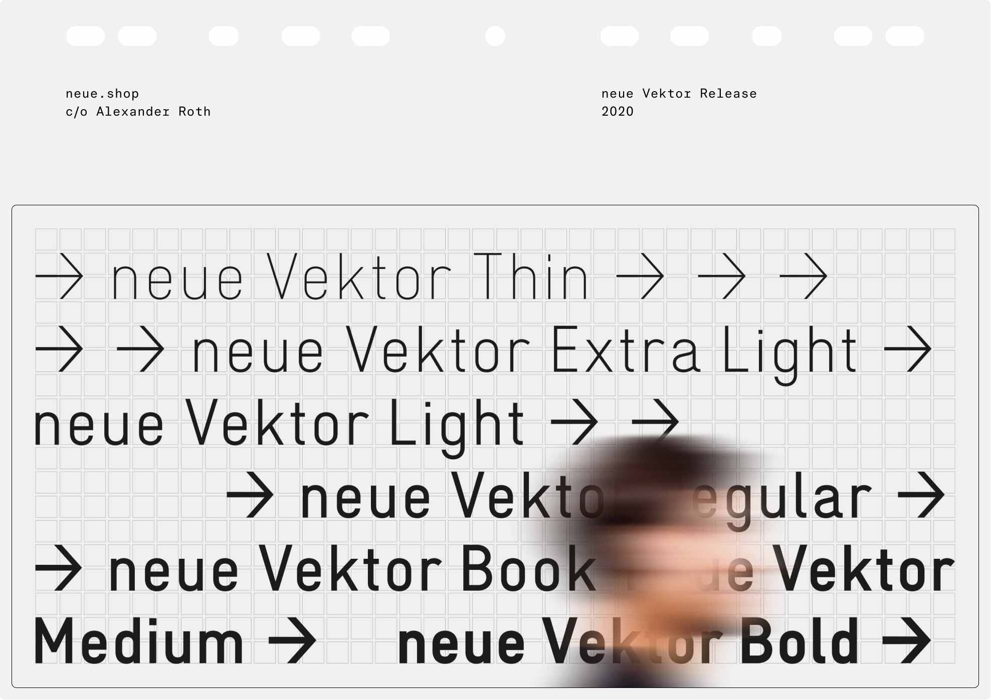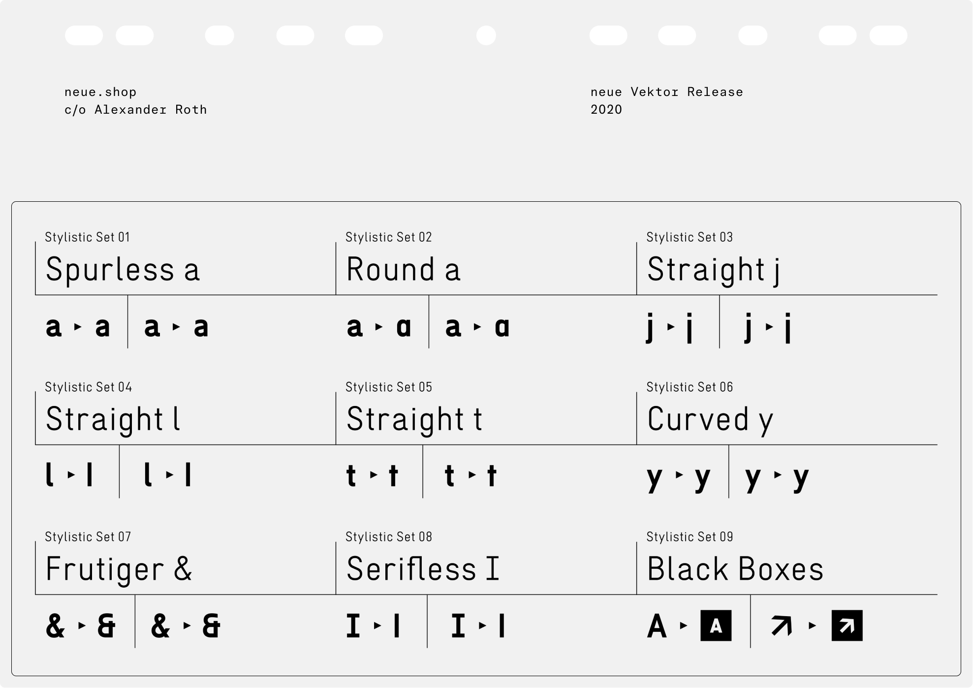 neue Vektor is subject to the idea of “one destination, two routes”: satisfying one particular design demand with identical characteristics such as character set, number of styles, OpenType functionalities and metrics, but doing it so in two stylistically different ways.