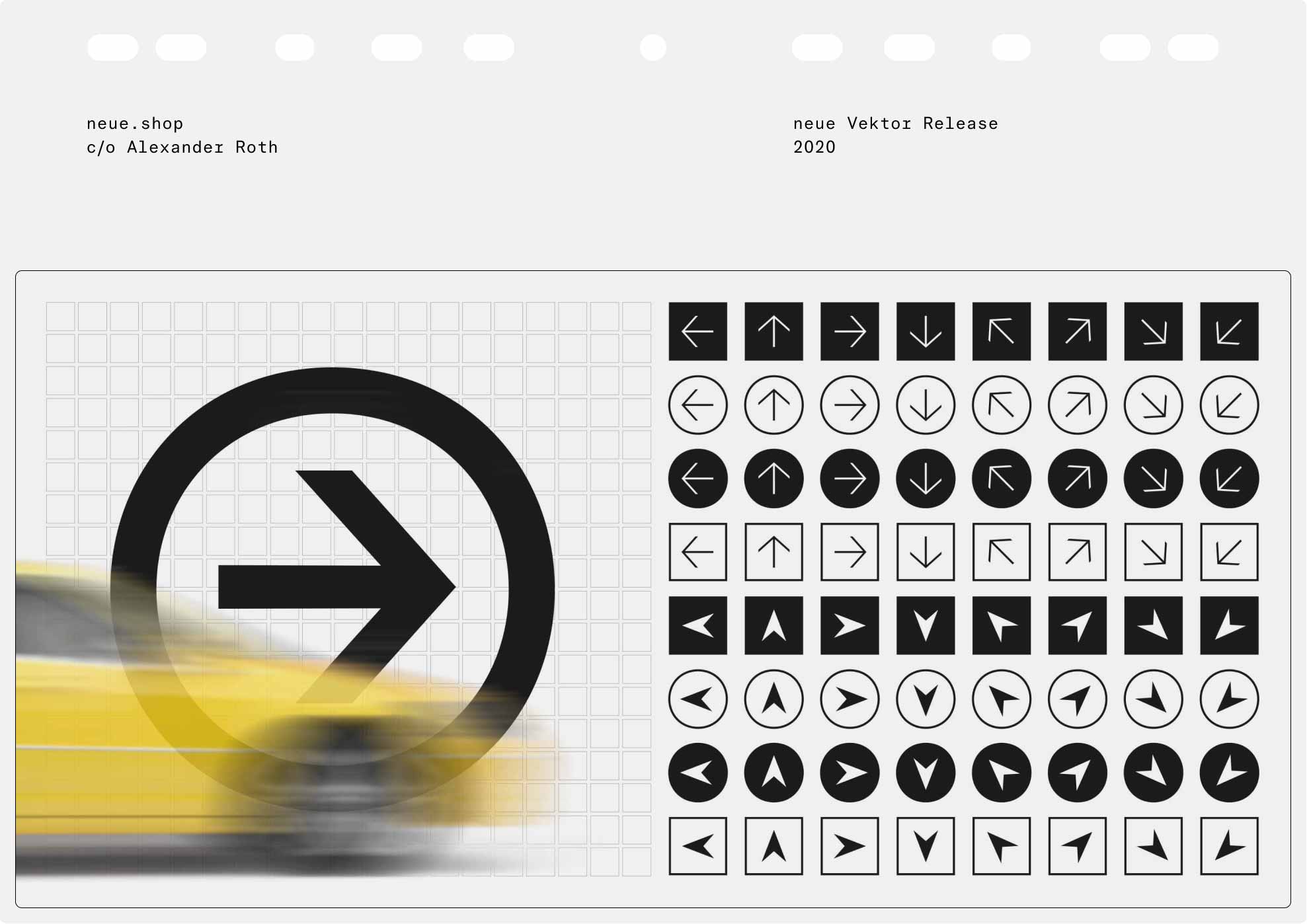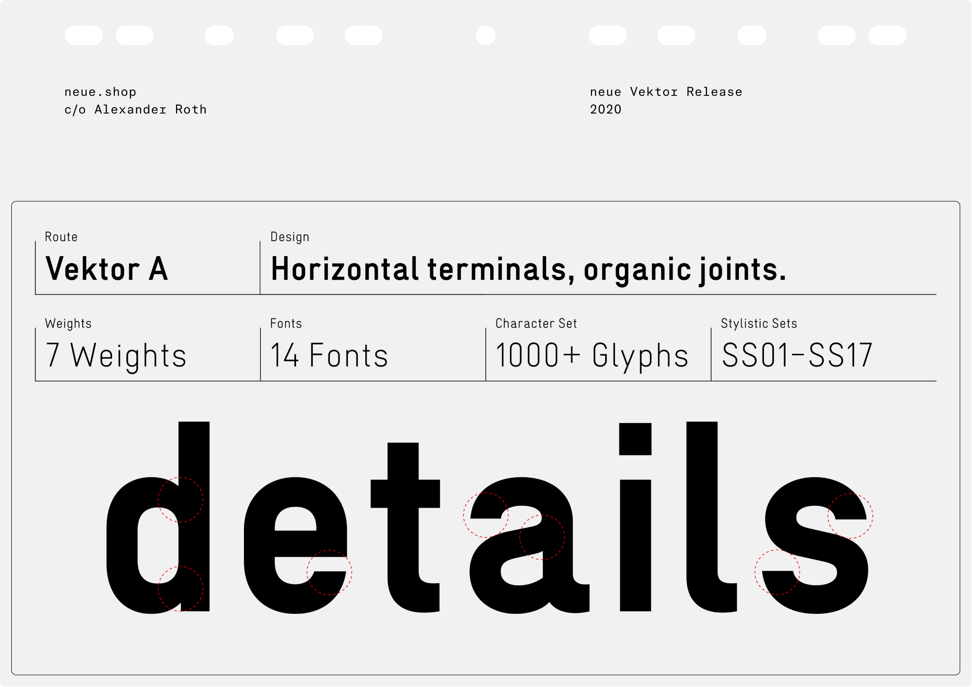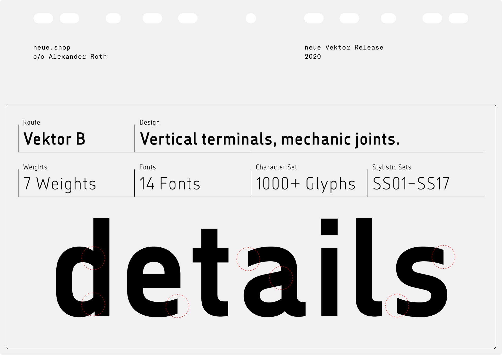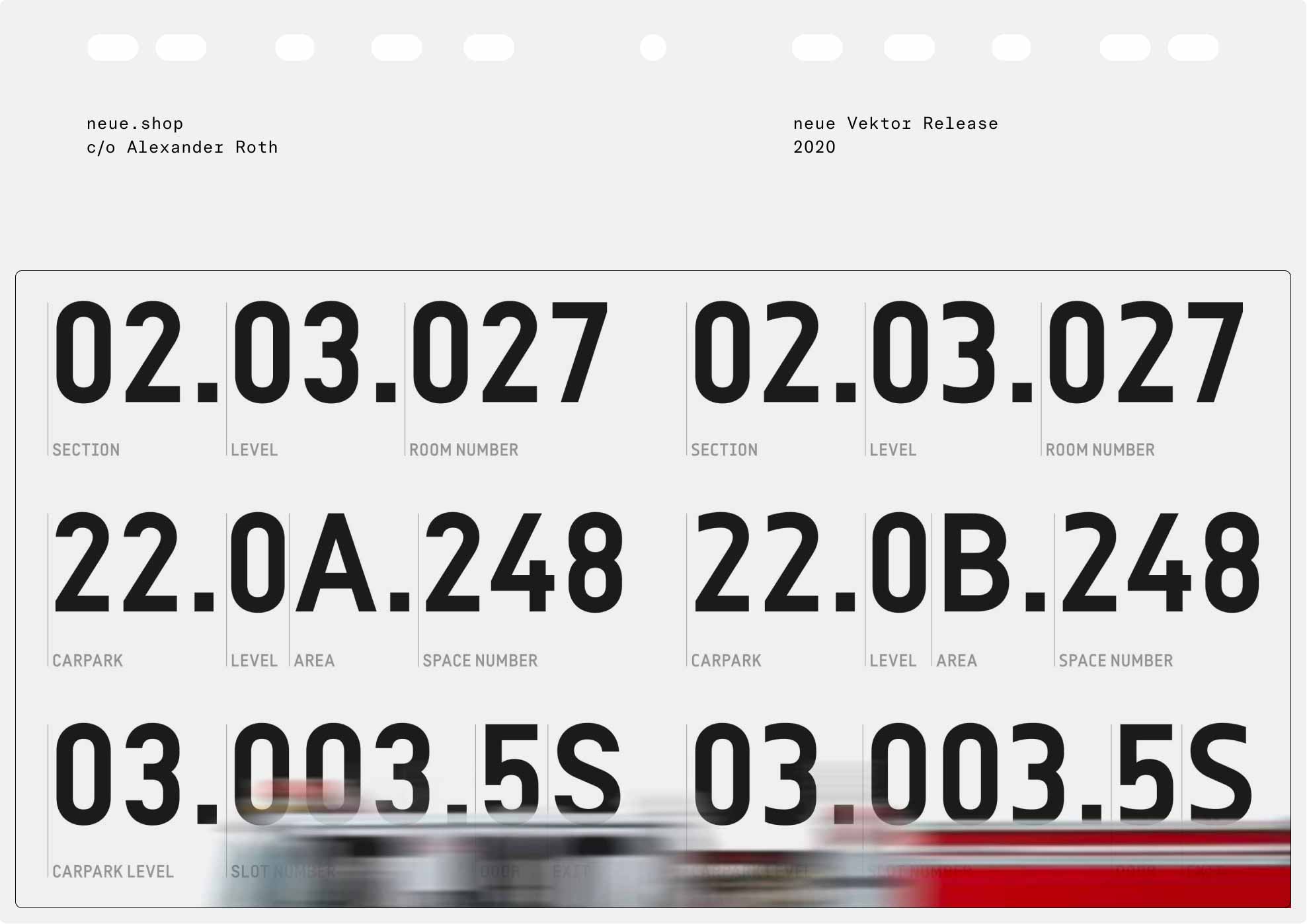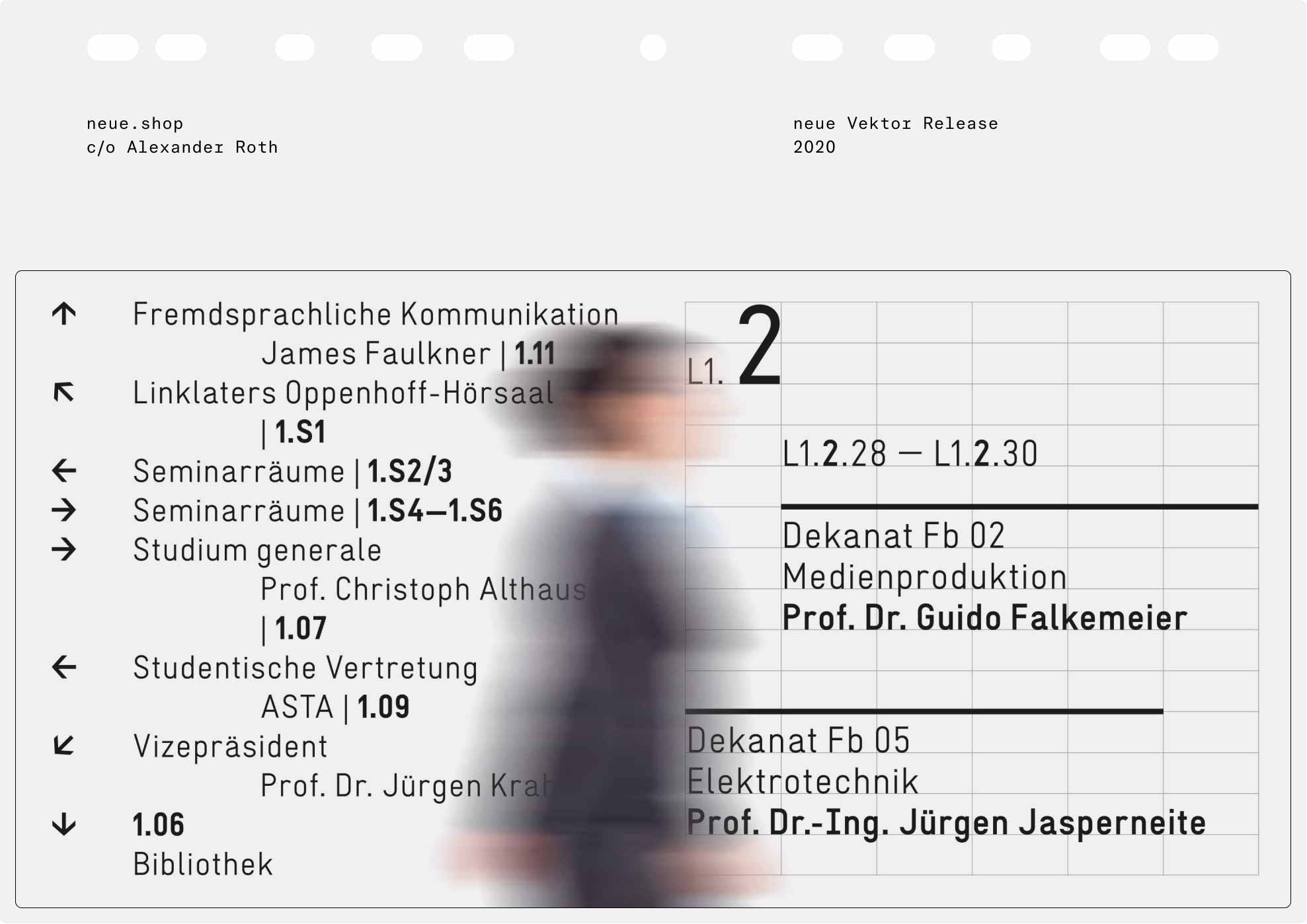 neue Vektor is subject to the idea of “one destination, two routes”: satisfying one particular design demand with identical characteristics such as character set, number of styles, OpenType functionalities and metrics, but doing it so in two stylistically different ways.