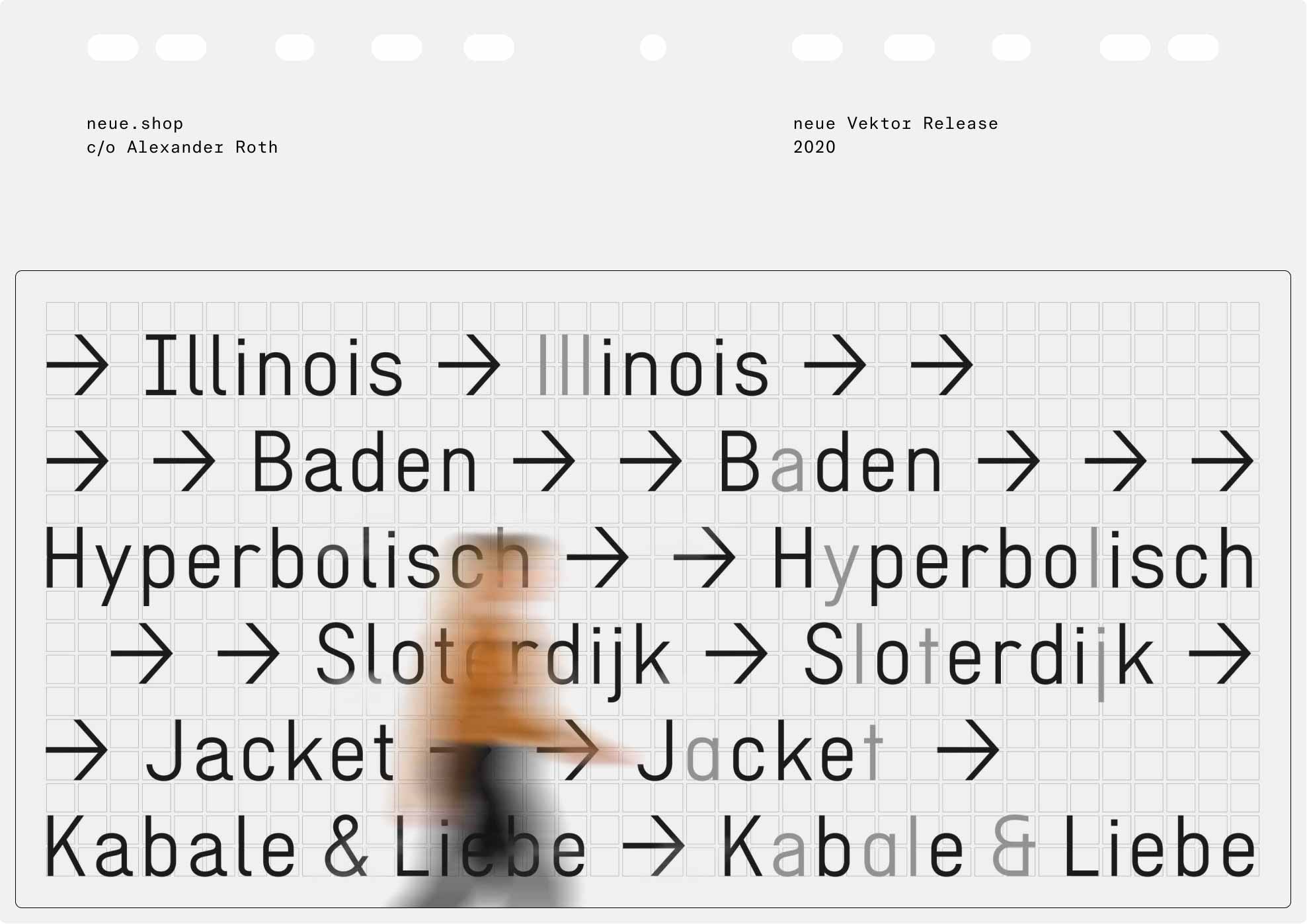 Try before you buy. neue offers Trial Fonts for each family with a reduced character set Download trial fonts. Want to customize one of our retail fonts? Sometimes a small modification of an already existing neue font does the job Learn more about Custom Fonts. Let’s have a Video Call in case you prefer it over writing emails Schedule a video call. Get in touch: neue, c/o Alexander Roth, Gartenstraße 10, 32756 Detmold, Germany Find us on the mapEmailInstagramLinkedIn.