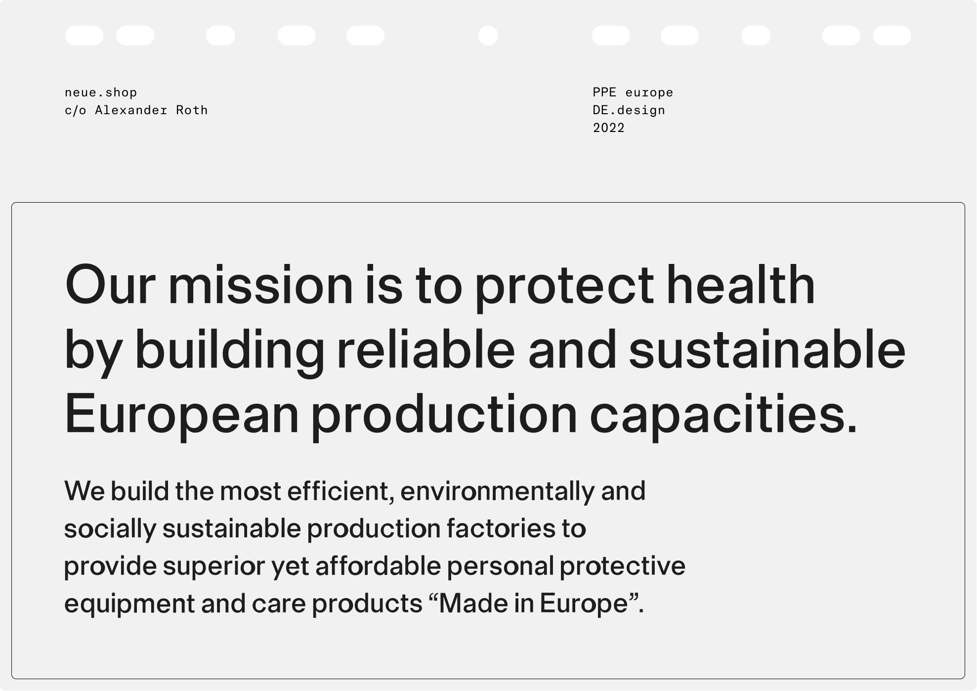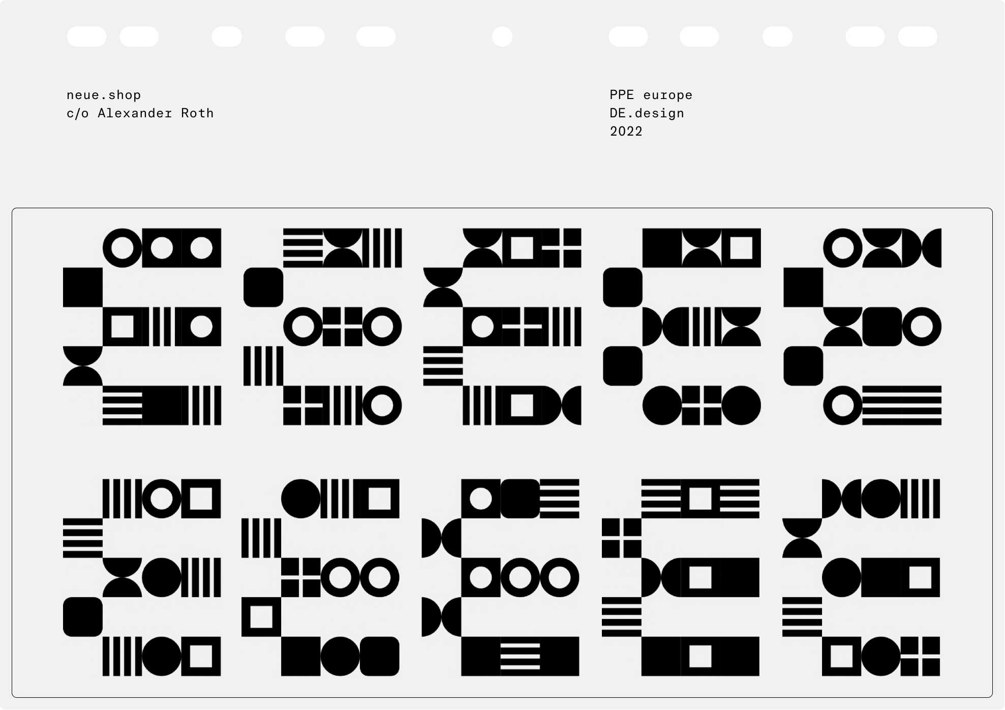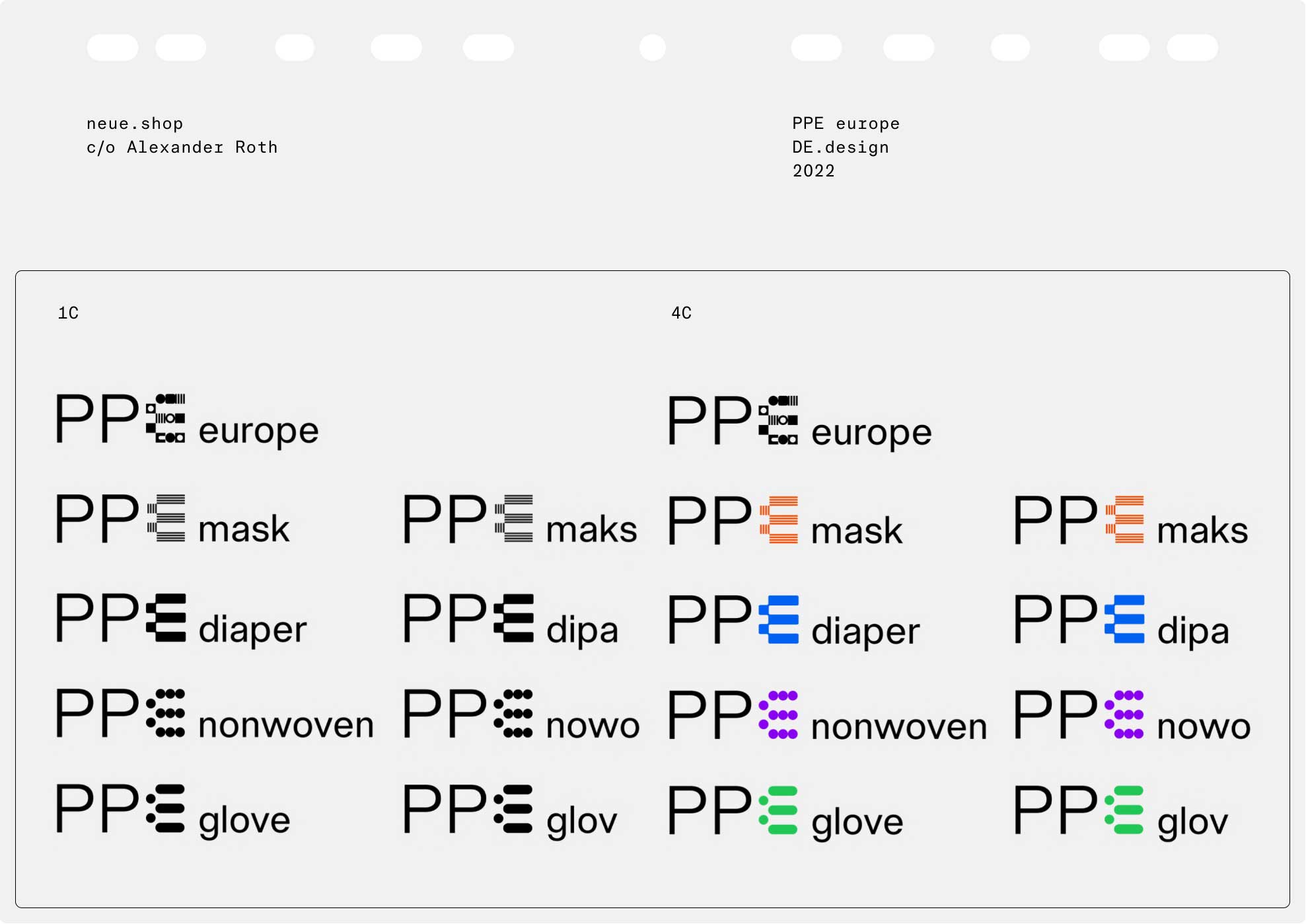 Together with the German design collective DE.design a visual and strategic branding for PPE europe was developed — the leading manufacturer for personal protective equipment in Europe. Custom neue Singular and a permutating logo make up its visual identity.