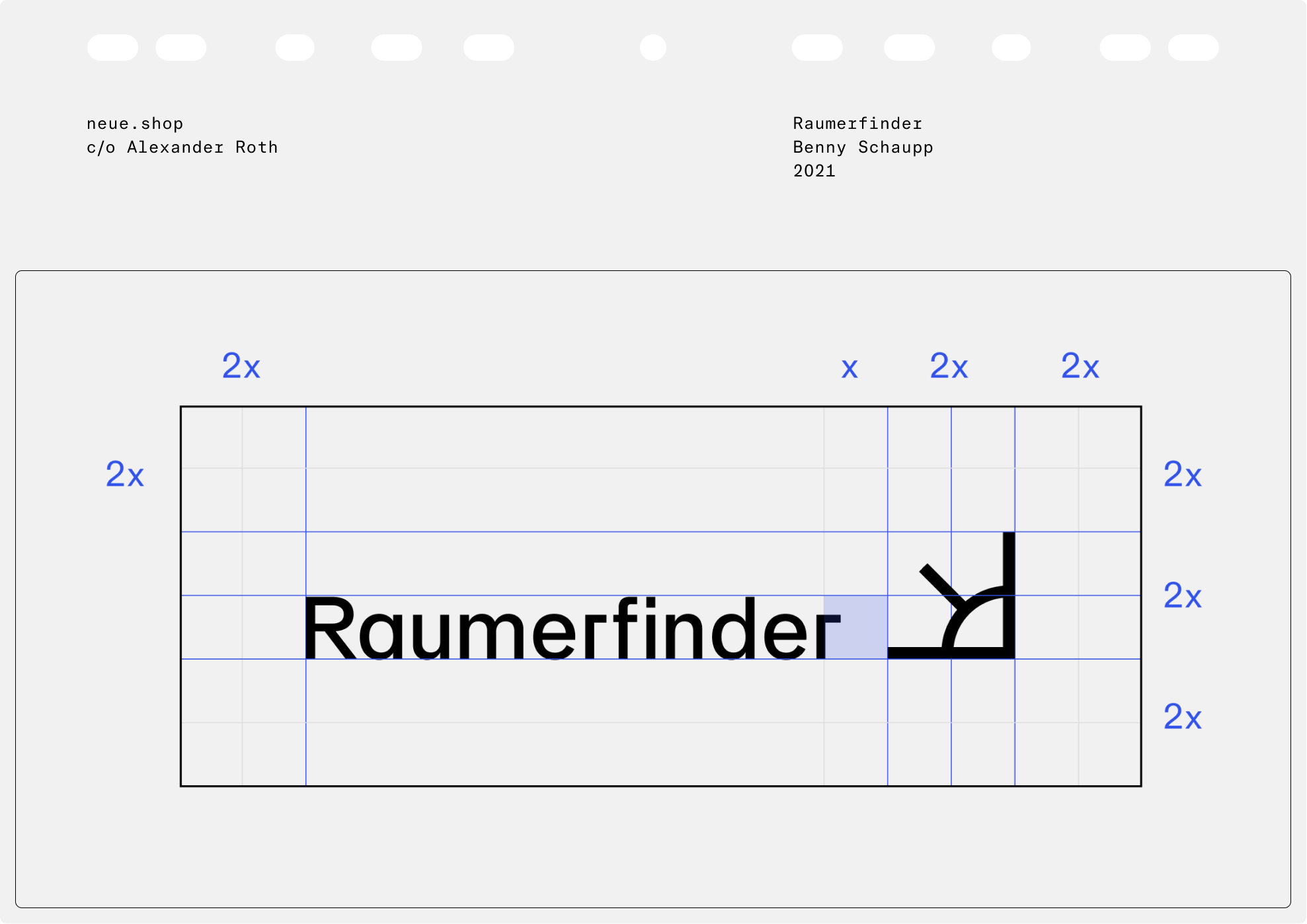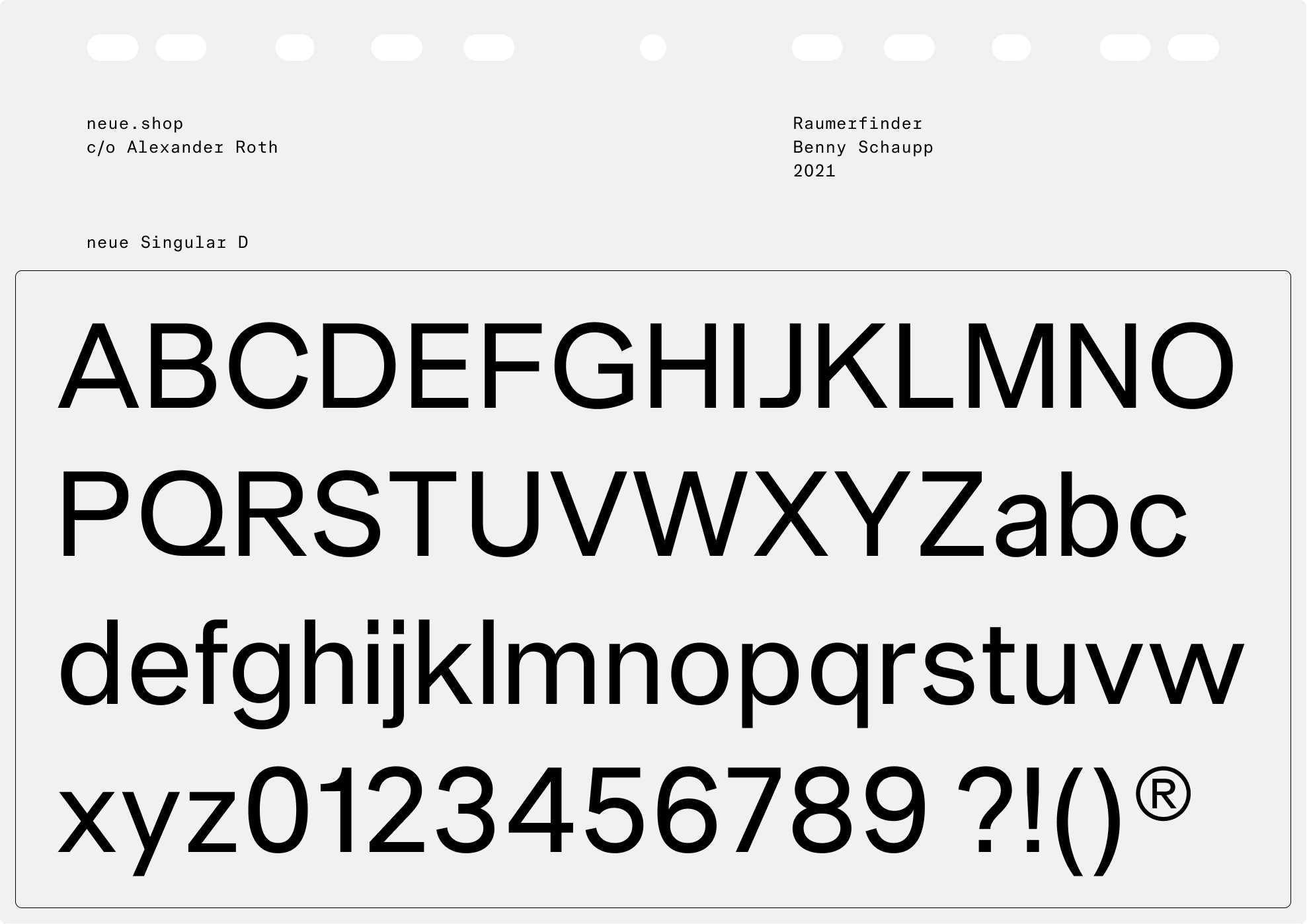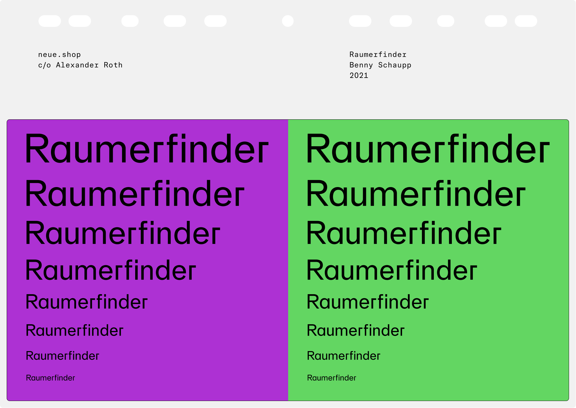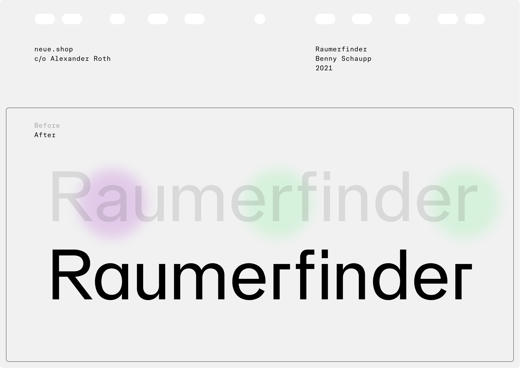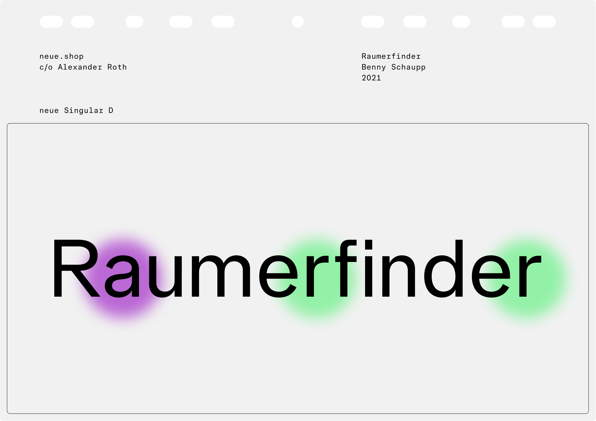 Raumerfinder is a Berlin-based studio spacializing on architecture, augmented reality and 3D visualization. In collaboration with Benny Schaupp neue developed a logotype that features our neue Singular typeface in a profoundly modified version.